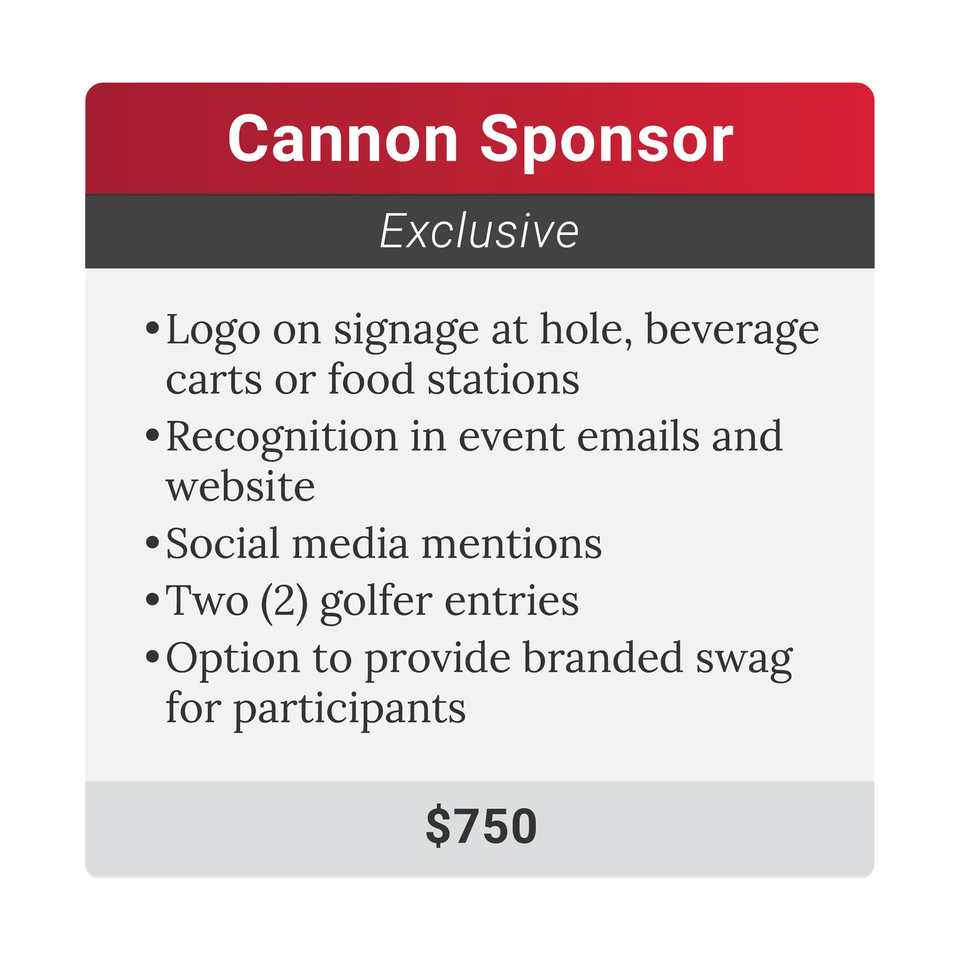 As the exclusive Cannon Sponsor, your brand will be showcased at one of the most exciting spots on the course—the Golf Cannon hole! Your logo will be prominently displayed at the hole, on beverage carts or food stations, and in event promotions. This package includes two (2) golfer entries and the option to provide branded swag.