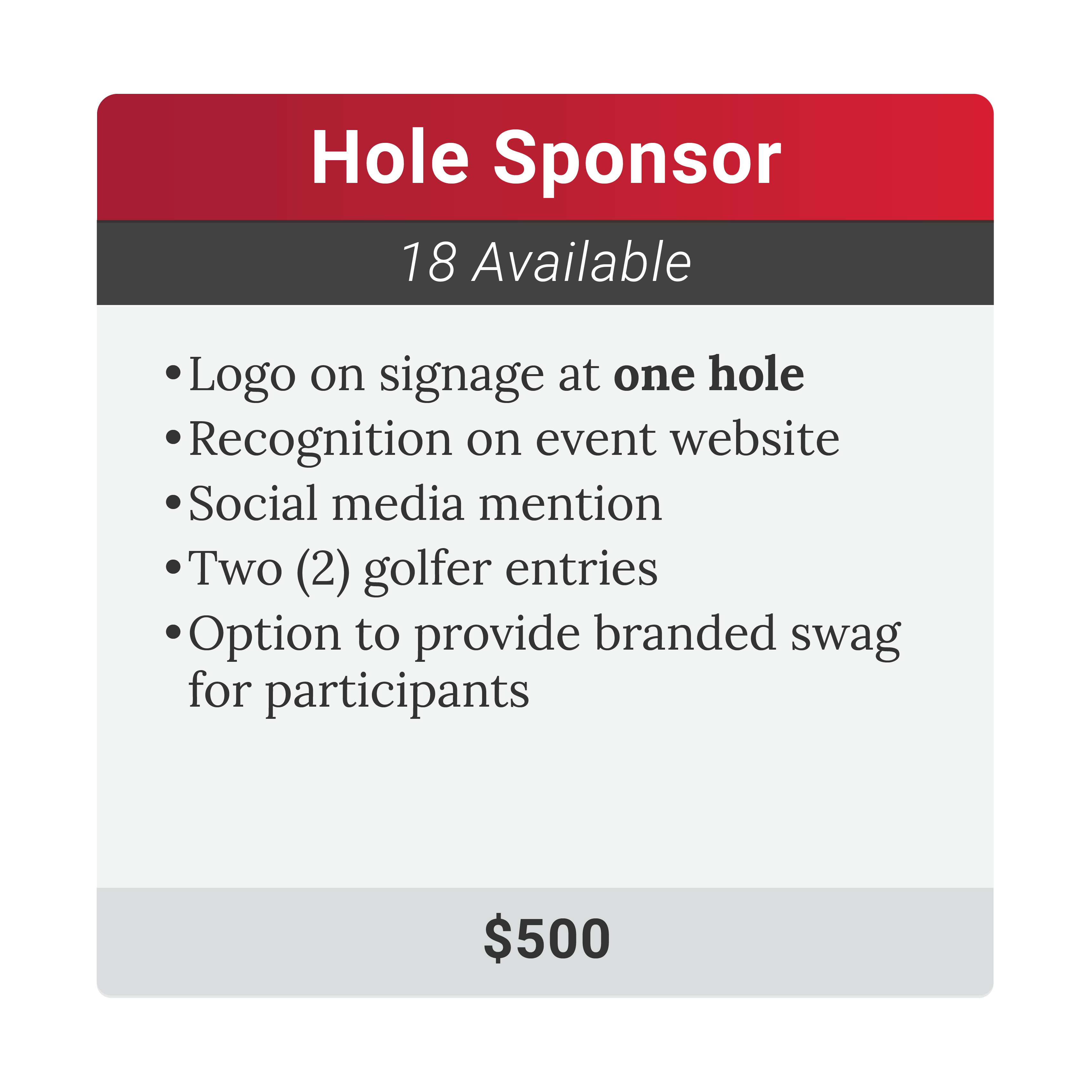 Your sponsorship includes premium signage at the tee box, recognition on the event website, a dedicated social media shoutout, and two (2) golfer entries. You will also have the opportunity to staff your hole and distribute branded merchandise, creating meaningful face-to-face interaction with every team that comes through.